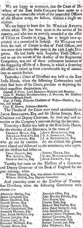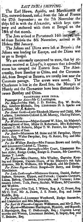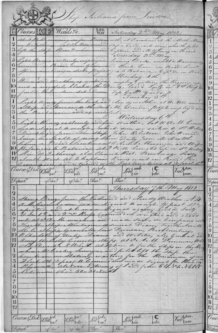 [Born 2 Jul & bap Bromley, Kent 28 Jul 1784, s of Richard & Mary; midshipman Northampton (2) 1801; 4th mate Northampton (2) 1802/3; 3rd mate Northampton (2) 1804/5; 2nd mate Northampton (2) 1806/7; 1st mate Lord Keith 1809/10; Captain Juliana 1811/2; Captain Warren Hastings (5) 1814/5, 1818/9, 1822/23 & 1824/5.] |