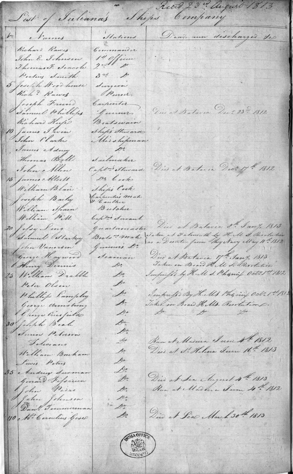 Died at Batavia 17th Jany 1813. Taken on Board HMS Revolution. |