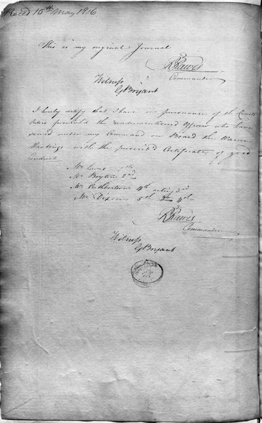 R. Rawes [signed] Commander. Witness: G. Bryant [signed]