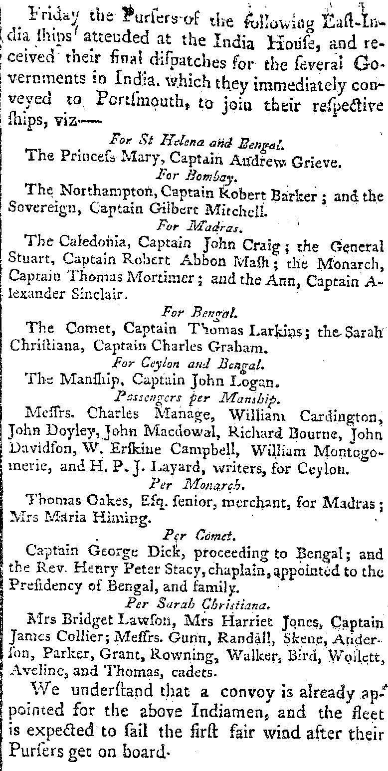 C&D ----. At 4pm Came to an Anchor with the small Bower in 13 fms Water Dungeness bearing WbS. The South Foreland EbN about 5 Miles off Shore. At half past 10pm Weighed & made Sail with a Light Breeze from the SE, at half past 4am Came to Anchor with the small Bower in 17fms. The South Foreland bearing NE½N Dist off Shore about 4 Miles. At 9am Came on Board William Joseph Knocker Pilot & took Charge. Came on Board a Lieut from his Majestys Schooner the Milford & pressed 7 Hands. At 10 Weighed & made Sail. At half Past 11 Came too an Anchor in the Downs. The South Foreland bearing SW½W. Sandown Castle NWbW Dist off Shore about 2½ Miles. Came on Board a Lieut from the Amelia Frigate & pressed several of the Hands. At 2pm I went on Shore to obtain Hands to assist in working the Ship to her Moorings in the River. At 7pm Came on Board with 18 Men. NB This Log contains 36 Hours & ends at Midnight.