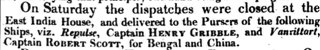 [Nicholas Gribble Glass, Purser Hope (2) 1806/7; Marchioness of Exeter 1808/9; Hope (2) 1810/1, 1812/3 & 1814/5; Bridgewater (5) 1816/7; Lowther Castle 1818/9, 1820/1 & 1822/3; Warren Hastings (3) 1824/5 ; Repulse 1826/7, 1828/9 & 1830/1; Warren Hastings (3) 1832/3. It is probable that Captain Henry Gribble and Nicholas Gribble Glass were related.] |