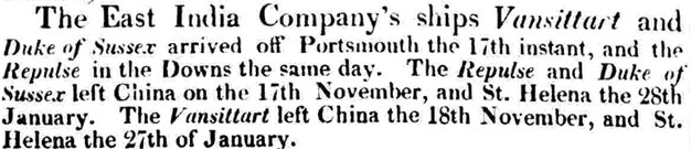 [John Salmon Rugg, born 12 Oct & bap Detling, Kent 15 Nov 1808, son of Robert & Ann; midshipman Kellie Castle 1824/5 & 1826/7 (home from China as 6th mate Farquharson); 6th mate Repulse 828/9; 5th mate Repulse 1830/1; 4th mate Warren Hastings (3) 1832/3. Brother to Jane Rugg, whose Will was proved in 1849. John Rugg died at Debtling on 2nd March 1878 aged 69.] |