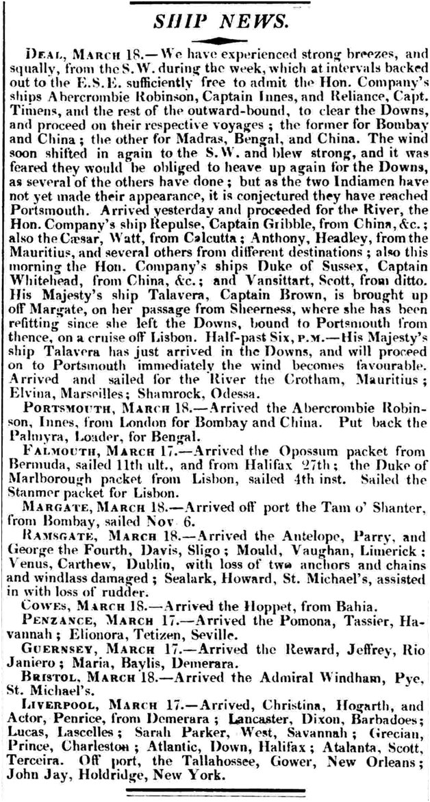[Henry Gribble was born in north Devon 7 March 1804 and bap in Cross St Chapel, Barnstable on 10 July 1804. He came from a HEICS family of ship captains and officers, he was the son of Captain Charles Besly Gribble, & Mary Ann his wife. His HEICS career started with midshipman: Princess Charlotte of Wales 1818/9; 2nd mate to St Petersburg 5m; 5th mate Princess Charlotte of Wales 1820/1; 5th mate Herefordshire 1822/3; 3rd mate Charles Grant 1824/5; 1st mate Princess Charlotte of Wales 1826/7; Captain Repulse 1828/9 & 1831/2. In 1839 he was author of an account of a Journey to Canton. His wife was named Harriet, born Hampstead, and was living in Kensington in 1851 his wife and children Marie, born Hampstead, Beatrice, born Hampstead, Agnes, born Macao, Catherine, born Macao, Ellen, Kollongsoo Amoy, and Henry, born Hampstead. He died in 1856, leaving a Will.