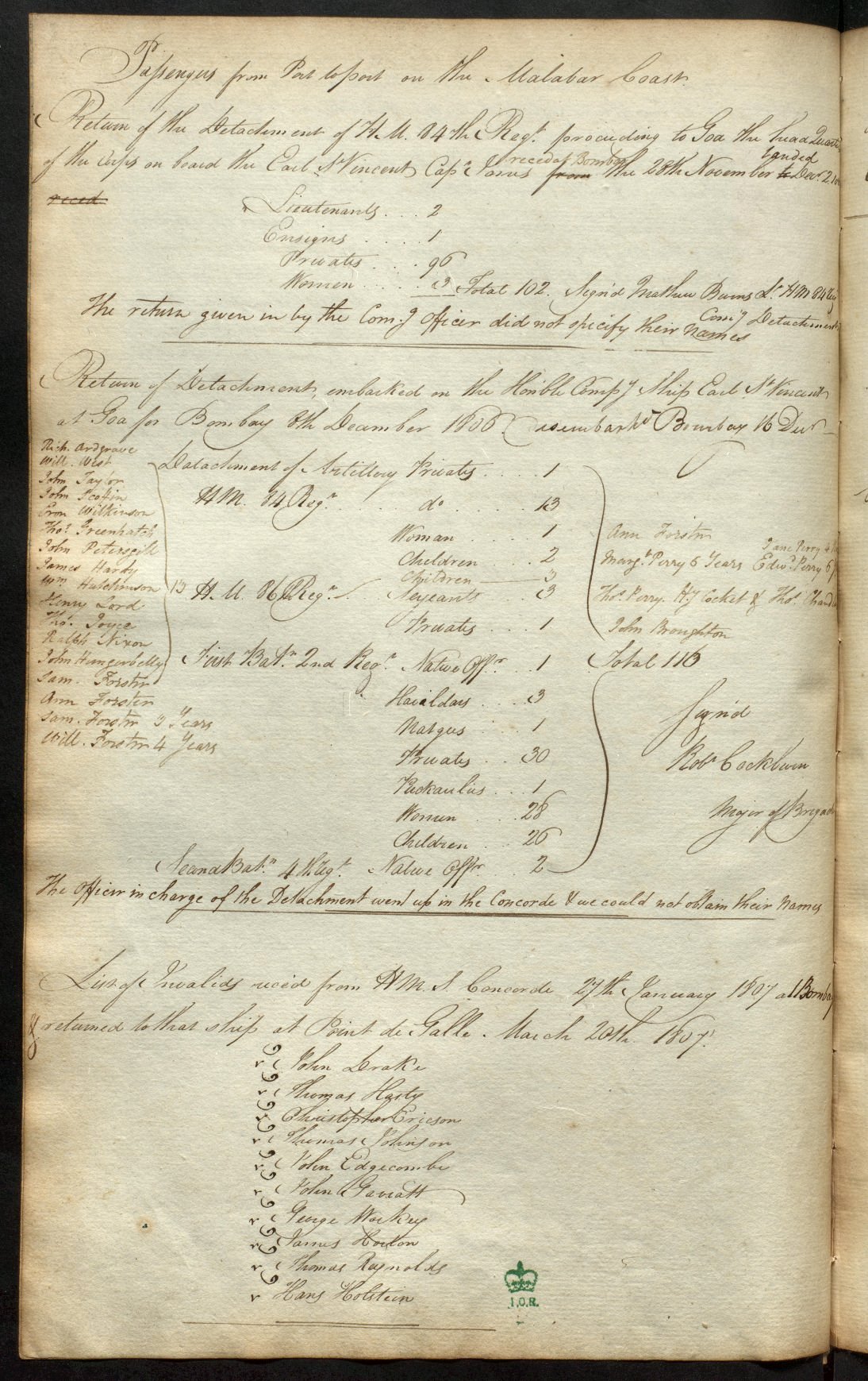 List of Invalids rece'd from HMS Concorde 27th January 1807 at Bombay returned to that ship Point de Galle March 20th 1807.