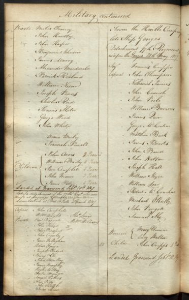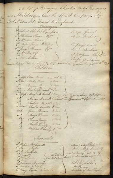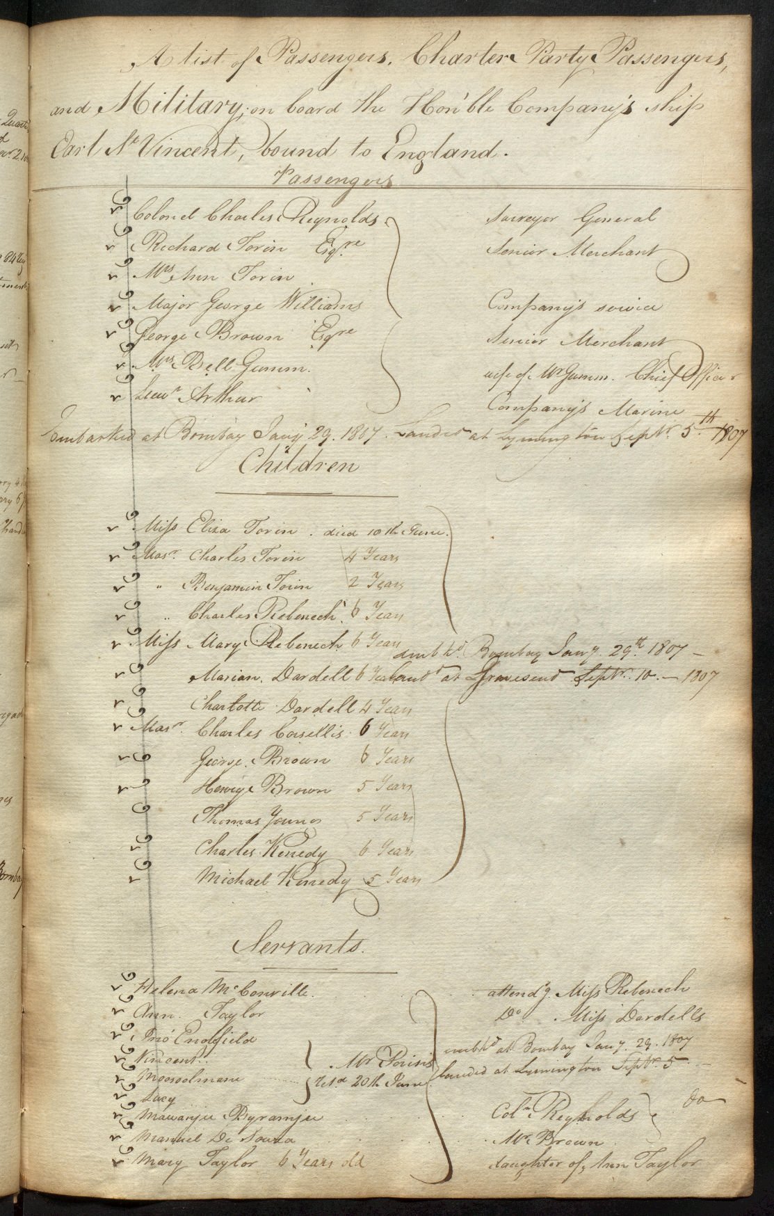 A list of Passengers, Charter Party Passengers and Military on board the Hon'ble Company's ship Earl St Vincent bound to England.