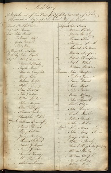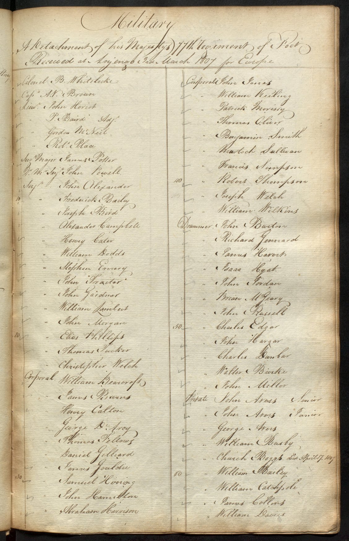 Fresh breezes from the East with cloudy weather. At 8am repeated The Leopard’s signal to prepare for Sailing & every body to repair to their respective ships. Employed rec’g the water & Provisions for the troops & Passengers baggage. PM Embarked Thirty Recruits for His Majesty’s 34th, 67th & 74th Regiments.