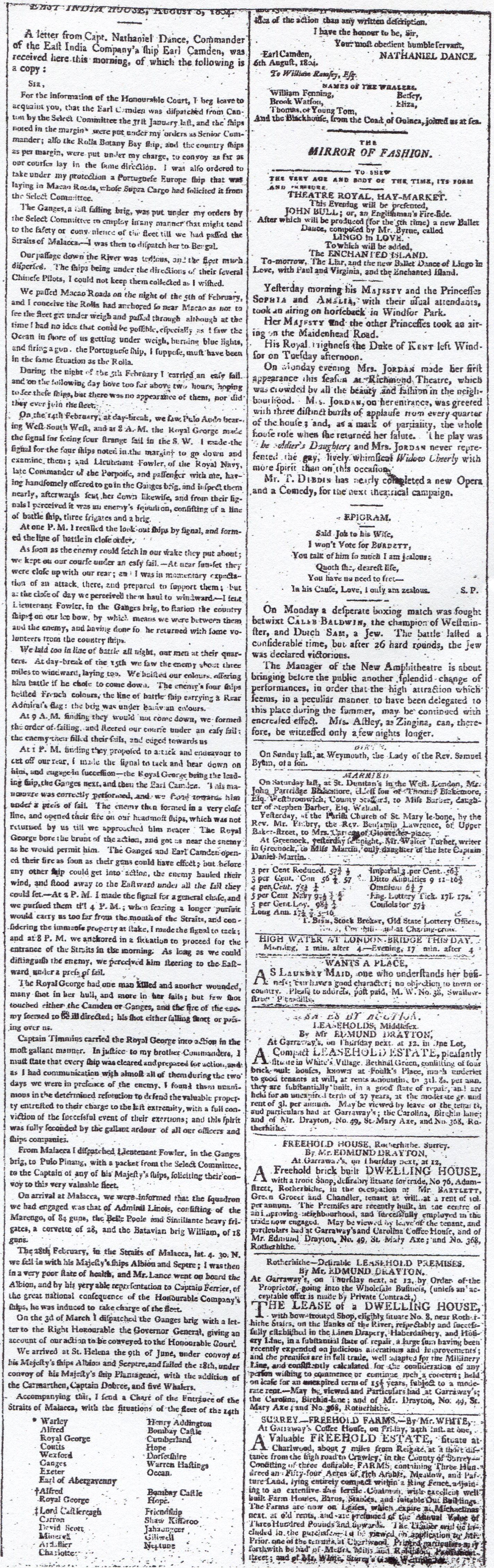 First & middle parts Strong breezes & Squall at WNW with Showers of Rain. AM The H.C. Ship Bombay Castle made the Signal of Distress sent on board a Midshipman with 6 men to afresh & employed delivering Hon Coys Cargo & Private Trade latterly fresh breezes. Officers on board 1, 3 & 6th. C. Barnard [signed]