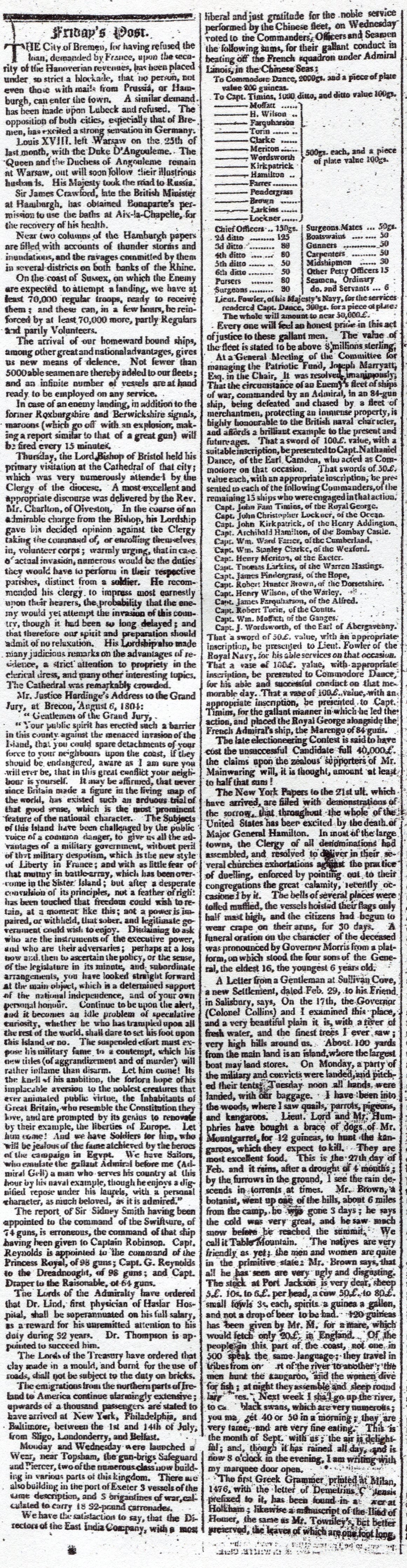 Fresh breezes from the SW for the most. Employed delivering Stores. Noon came on board 25 Lumpers to assist the delivering of the Ship. PM Opened the Gun Room Hatches & began delivering Hon Coys Cargo & Private Trade in the Burgess Hoy. Officers on board 1, 3 & 6th. C. Barnard [signed]