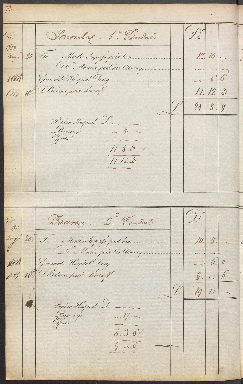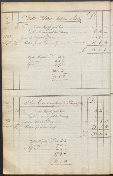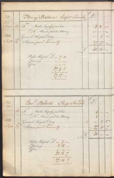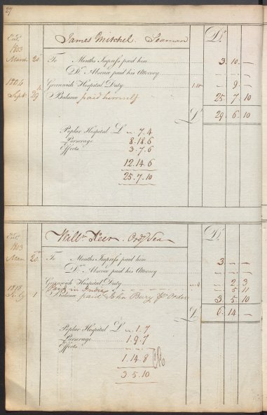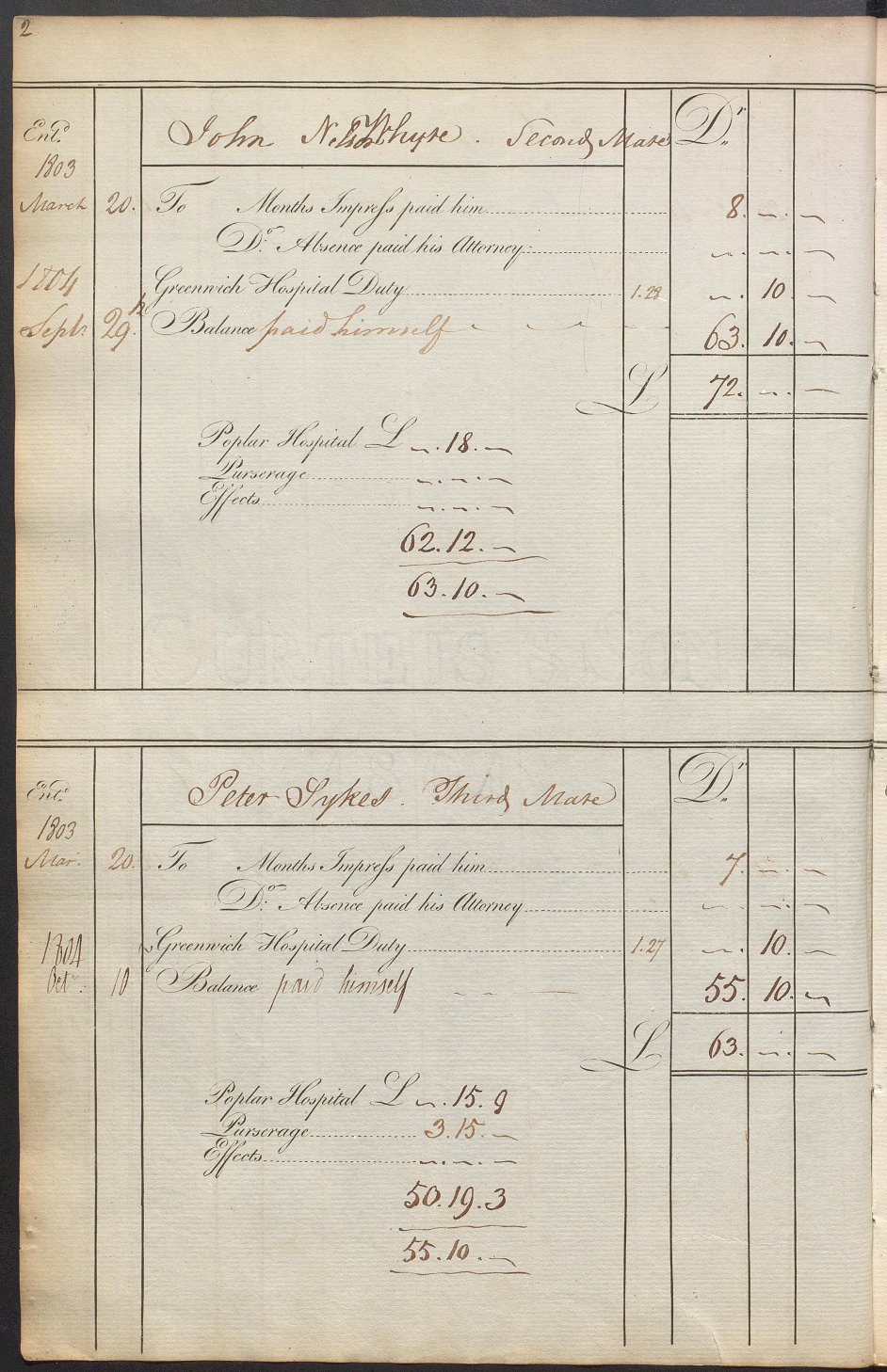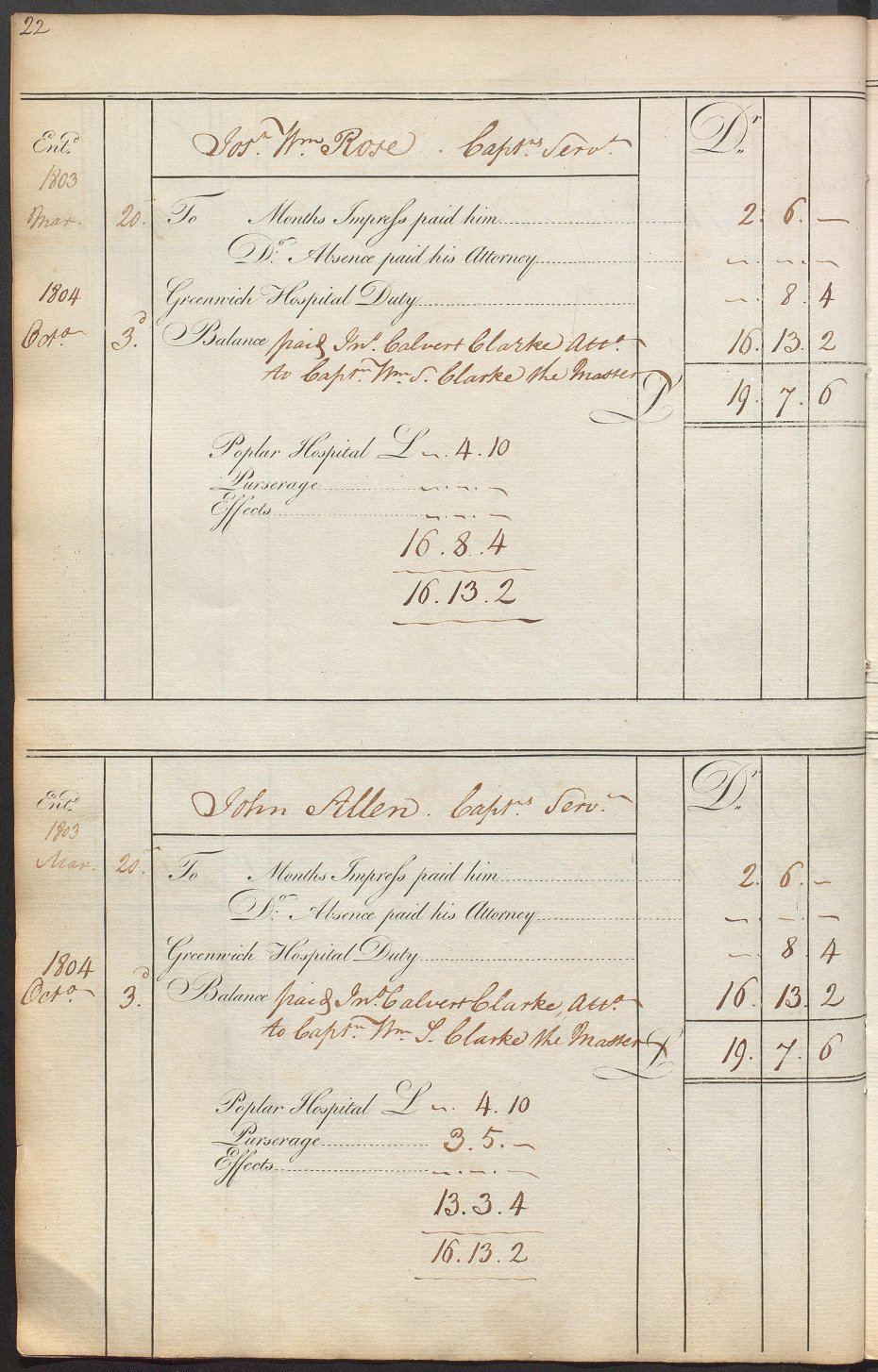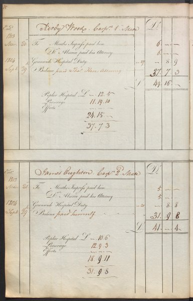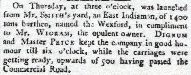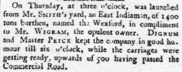 Light airs from the North with fine weather. PM cast off from Woolwich and dropped up to Blackwall Reach at 5 took in the Stern Junk & made fast alongside the Surat Castle, Country Ship Off Orchard Wharf , at ½ past 5 Capt. Clarke went on Shore. Officers on board 1,3 & 5th.