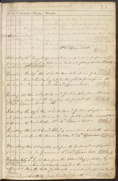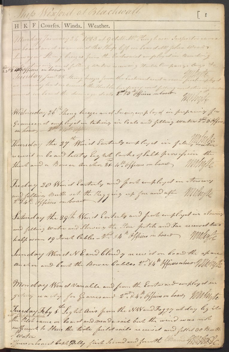 Moderate breezes from the East and fine weather, employed delivering Hon Coys Cargo. Passed by the Ganges from Long Reach. Officers on board 2 & 4th. JN. Whyte [signed]