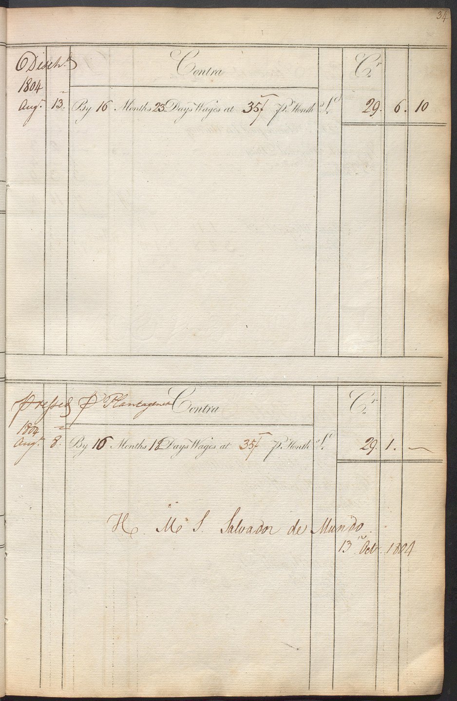 C&D NNW 110. First part light airs middle & latter pleasant breezes East with fine weather, Hove too Signal to lay too on the Star board Tack. Made Sail after lying by. Sick Report 6. Ship making 1 inch in 24 hours. AM Performed Divine Service. Expenditure of Water last week 726 Galls. At 6am the Alfred made the Signal for seeing Land. At ½ past 6 saw the Island of Ascension bearing NW½N distance 16 or 7 Leagues. At Noon the Island of Ascension at NWbN to WNW. Lat (obs) 8.4. South. JN. Whyte [signed]
