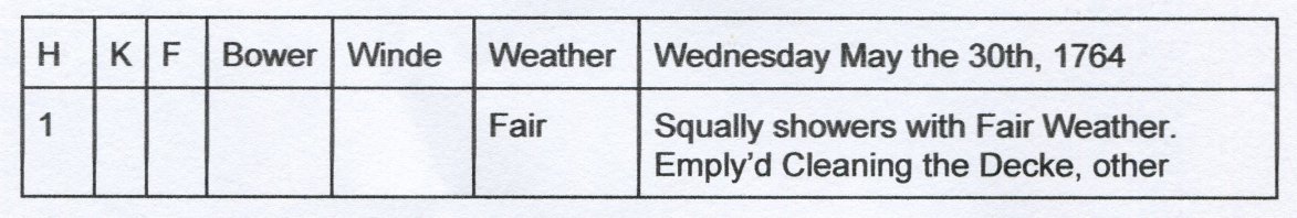Land and Sea Breezes with fair Weather. PM People Employed under the Boatswain, AM hoisted out the long Boat and Sent her on Shore, found she was not able to take anything in when ashore being very leaky hoisted her up to be caulked Sailmaker Employed as before, People overhauling the rigging.