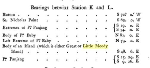 Light breezes of Wind & the chief parts fair Weather [ at AM] Came to with the Best [Bower] in 20 fm the Extremes of Thwart the Way [Middle Island or Pulo Renyang] from West to NW Distance 2 or 3 miles Anger SbW½W Cap SbE the Button. NbE½E At 7 AM Weighed light Winds variable AM Came to with the Best Bower 12 fm off Anger Point bearing as follows Angt Per SWbW Extreme of Thwart the Way [Middle Island or Pulo Renyang] NW to NNW, the SWbE, Cap NNE½E Dist. off Java Shore about ½ a Mile. Hoisted out the Cutter & Jolly Boat.