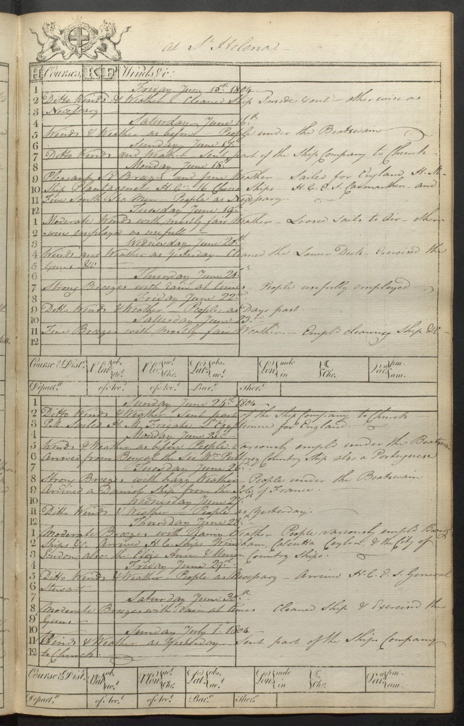 C&D N34W 95 miles. As 1PM The Commodore made the signal to weigh. At 4 weighed & stood off & on waiting for the fleet, at 7 signalled to steer NNW. The fleet consisted of H.M. ship Sampson, H.C. ships Phoenix Calcutta. William Pitt, Streatham, Europe, [Jane] Duchess of Gordon, Preston, Georgiana, Glory, Northampton, Ann, Comet, Tigris, Sir Wm Pulteney, Diana & Union, 2 transports SSE & 7 whalers [a ship noted later named as the Dina was either a transport or whaler]. Moderate breezes throughout with small rain at times. PM Stowed the anchors & unbent the cables, at 6 saw James Valley SbE distance about 3 leagues, extreme at SE to SSW. AM Roused the cables on deck to air, condemned the remainder of the old small bower & cut it up. Payed the cables down into the hold. At 11 signalled for the fleet to continue the same course although the Commodore did otherwise, do for the Streatham to lead the fleet, Commodore went astern to take a whaler in tow. At ½ past 11 the Europe made the signal for a strange sail in ye NE quarter inforced with 2 guns. I take my departure from the bearings at 6 PM allowing the Island to lie in Lat 15.55 Lon 5.49W of Greenwich. Lat 14.42S Lon 6.50W.